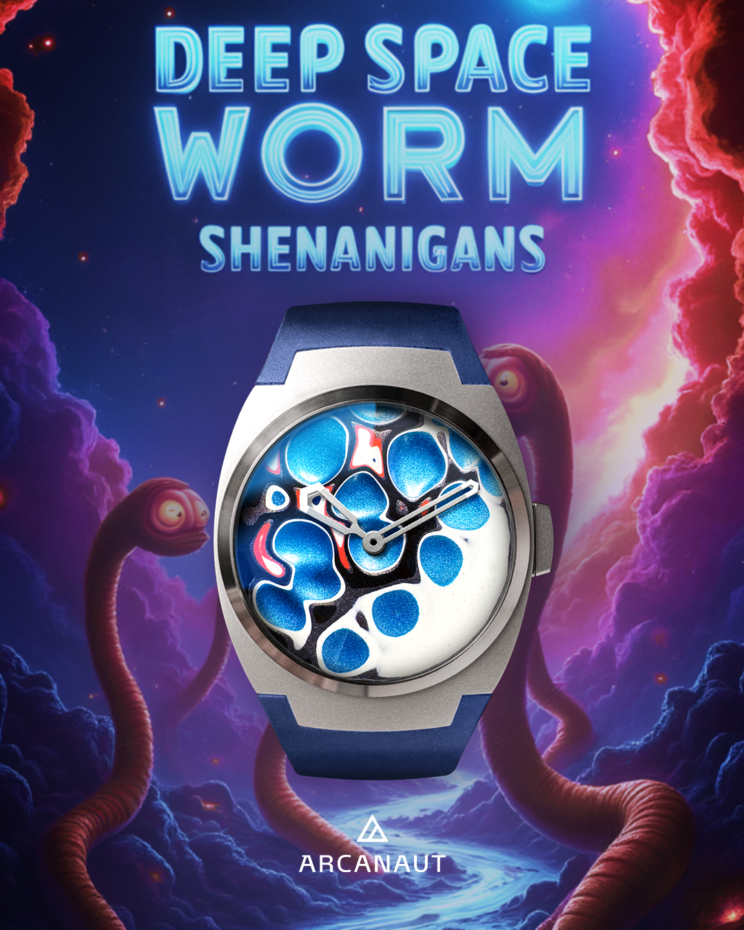 And so team Arcanaut created a dial in their honour. The many cosmic blue divets on this dial recalled the wormholes created by our slippery friends when they burrow from one part of the universe to another.