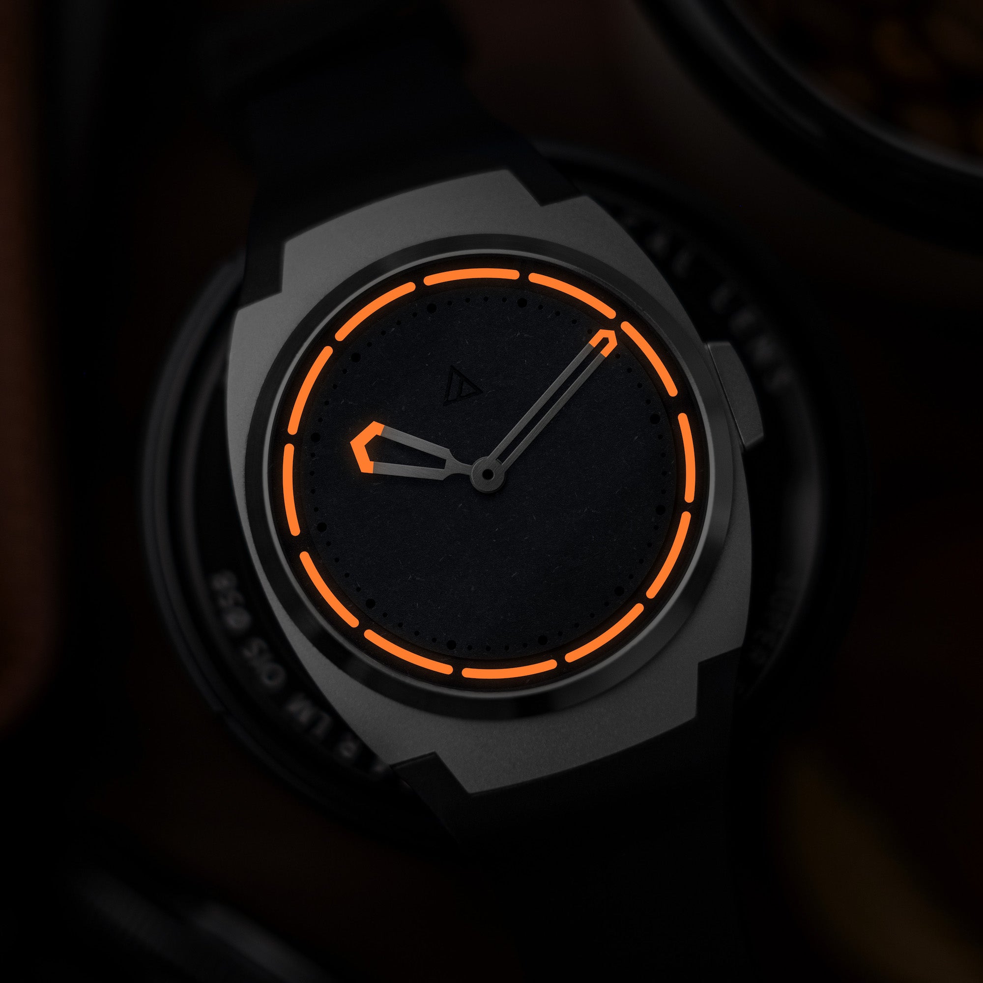 D’Arc Matter is an entirely new composite material made for the ARC II, developed by feeding Scandinavian slate stone through an industrial coffee grinder and then casting it under high pressure in a vacuum chamber. The result is a stone surface with a dark matte finish that limits reflection on the dial and enhances the distinct look of the ARC II.