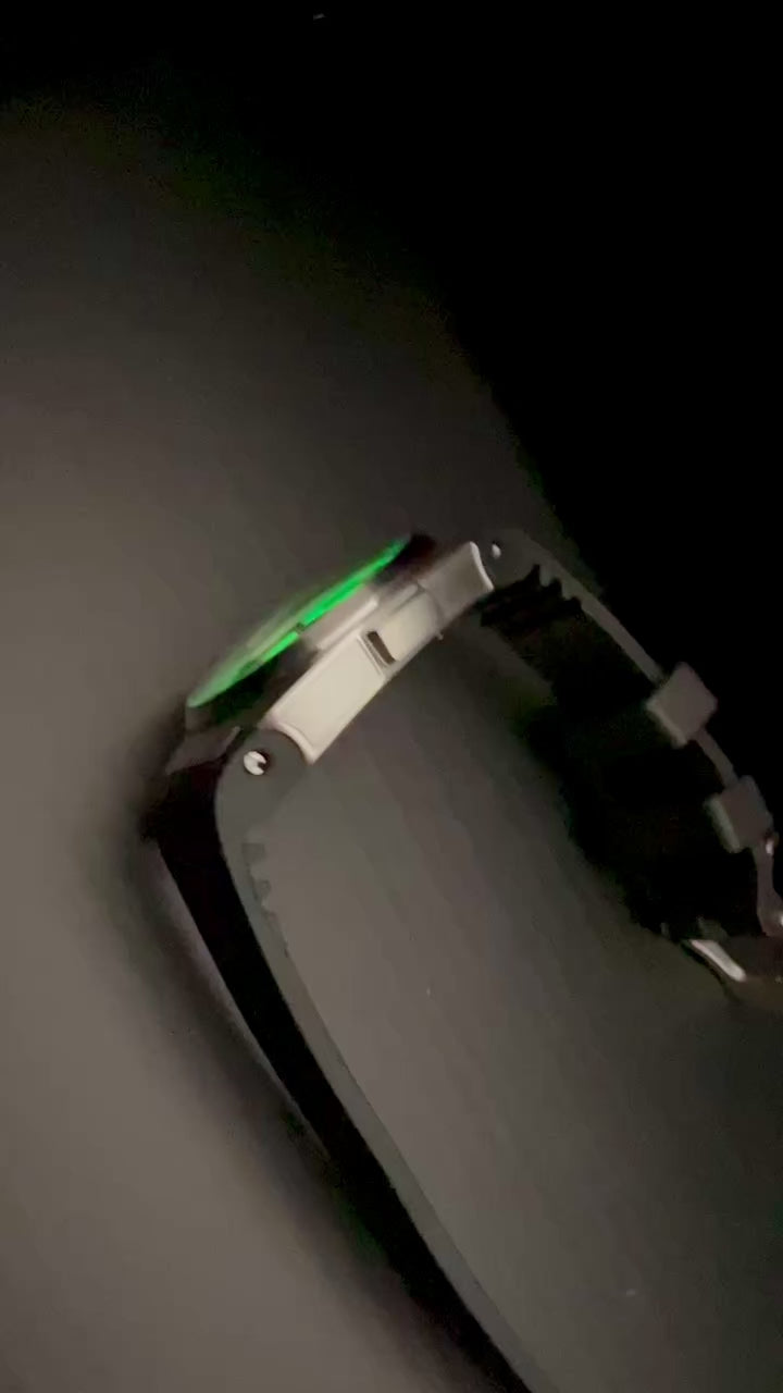 Housed in a 316L stainless steel case CNC-milled and assembled in Copenhagen, the Arcanaut Arc II — D'Arc Matter Gamma Green has a matte micro bead blasted finish, with brushed and hand-polished highlights applied in-house by our Danish watchmakers. The case features Arcanaut's signature "Pentablock" crown, the shape of which follows the form of the Arc case perfectly.