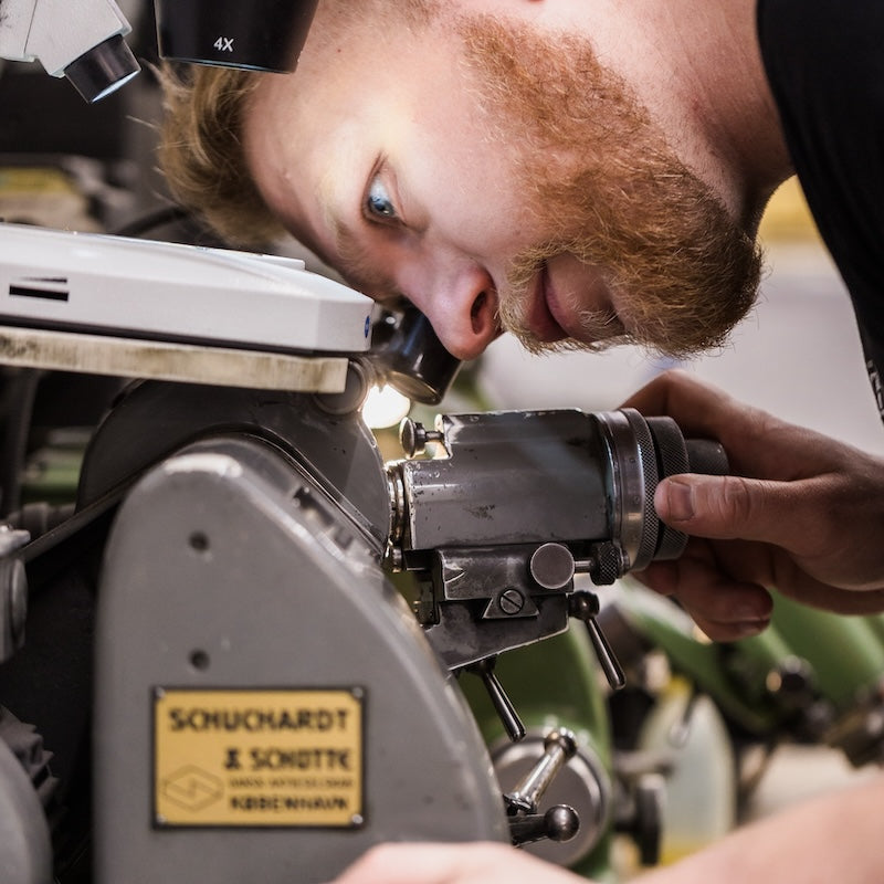 316L stainless steel case, CNC milled north of Copenhagen with tolerances down to a micron (a thousandth of a millimetre or about the same size as a bacteria). The case has received our new "skeleton framing" decoration, with matte micro-blasted recesses. As with all our watches, the case features our signature "Pentablock" crown, which is shaped to follow the form of the case perfectly.