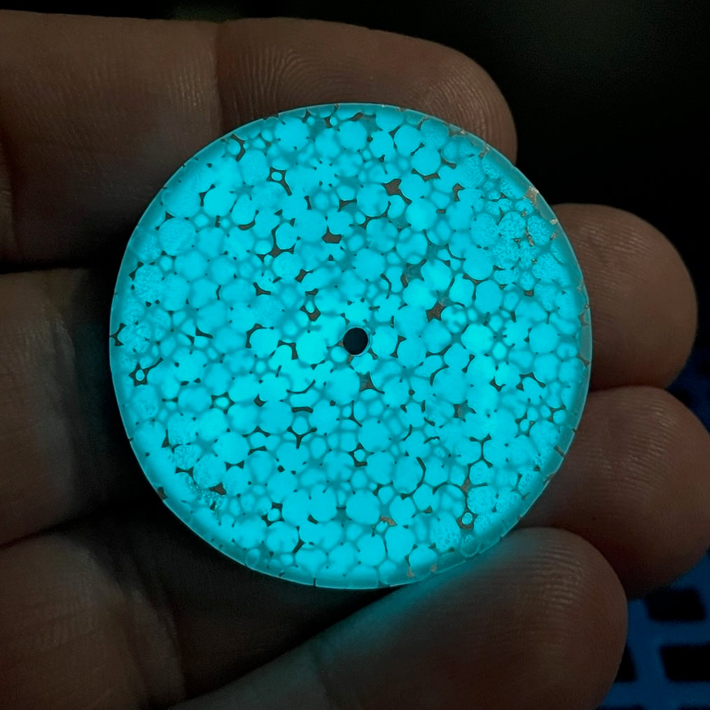 A solid disc of Badgerite lume, topped with resin-filled aerospace-grade aluminium foam