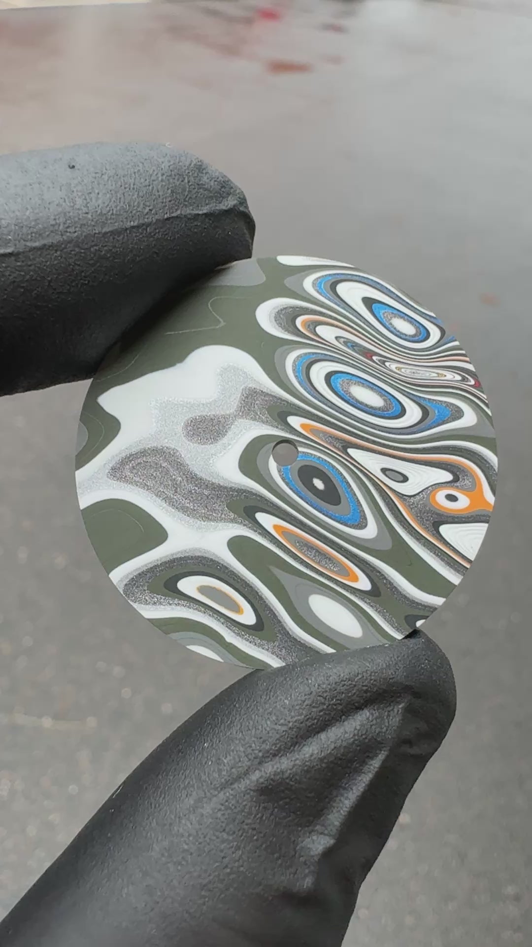This piece, “Primordial Predator,” comes from the Groovy type of Fordite dials, where we cut straight across the layers to reveal bold, flowing bands of color with a dynamic, psychedelic feel. It has muted camo greens, soft blacks, crisp whites, subtle blues, and scattered rings of a rare burnt-orange tone, all forming layered “eye” shapes that repeat across the surface. The polished finish lets these contours stand out sharply, giving the dial an almost watchful presence.