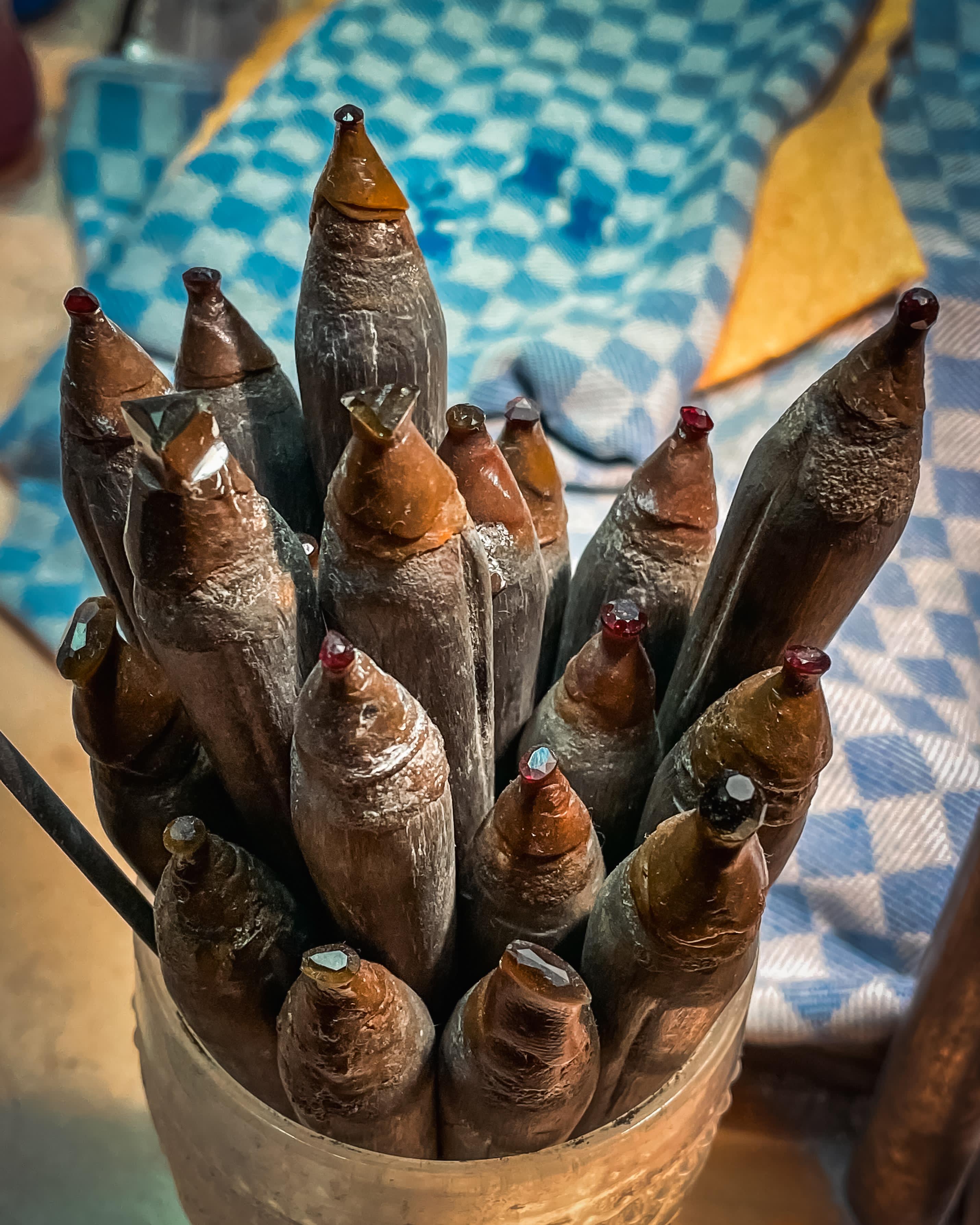These wax-tipped holders are used for delicate faceting on the diamond wheel.