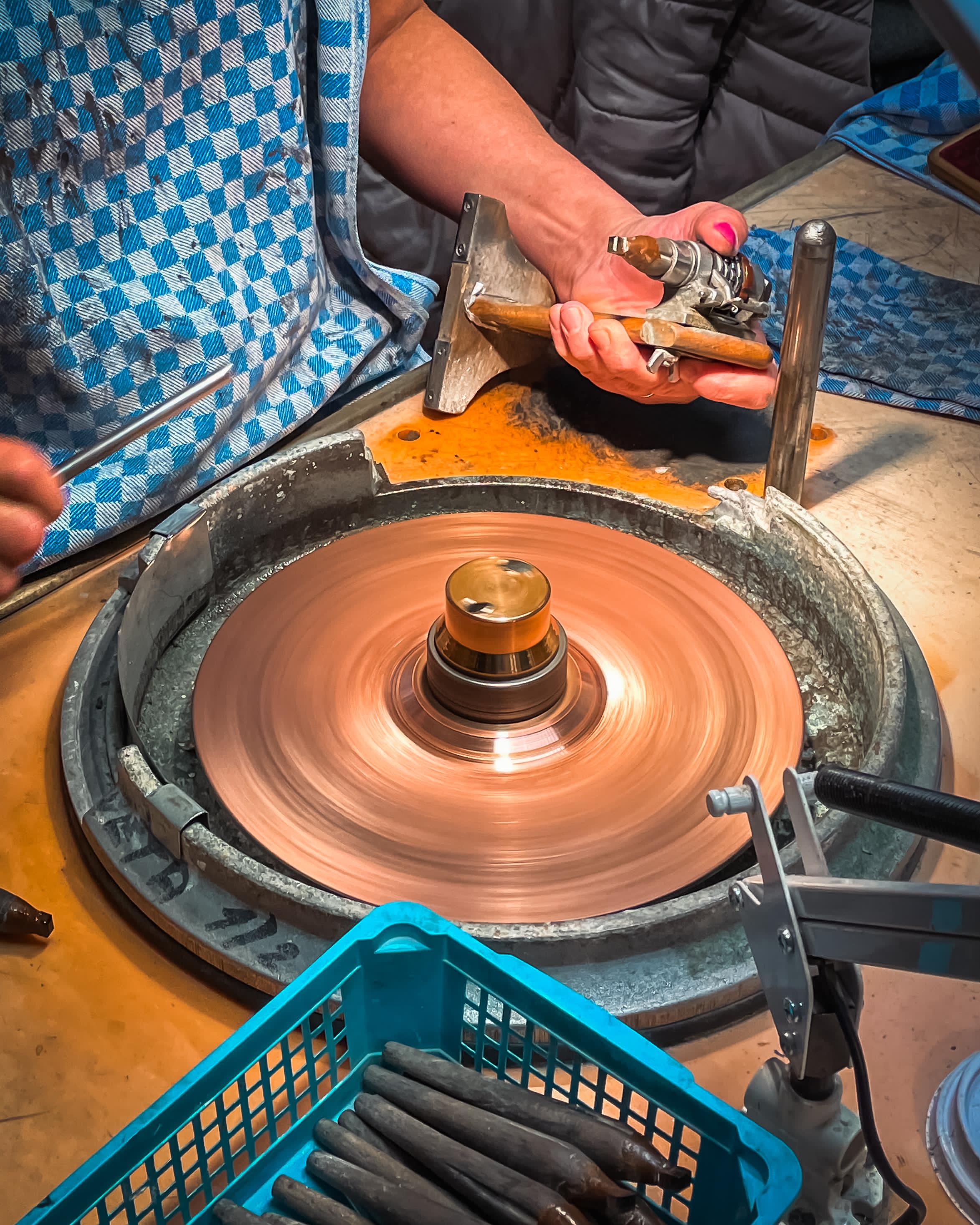 Hand finishing the stones on a diamond wheel takes a long time, but it's important every stone is polished before it leaves the factory! This was one of the conditions that Empress Maria Theresa stipulated to ensure only the finest quality of garnet stones would represent the Czech people abroad.