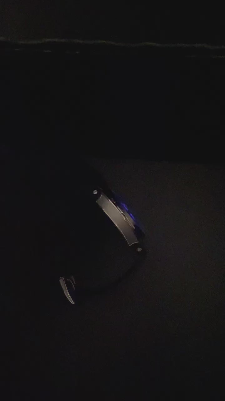 Our laser-cut micro-welded steel hands are made and hand-finished in Denmark and topped with solid Lumicast tips that glow purple as do the hour markers.